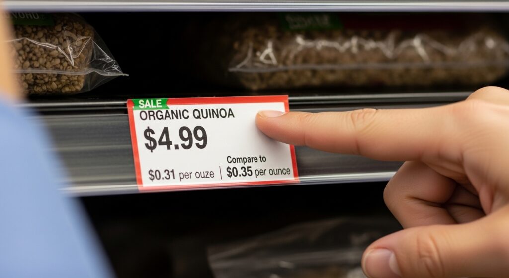 Look at the unit price (price per ounce, pound, or liter). Larger packages often cost less per unit, but only buy in bulk if you’ll actually use the item before it expires.